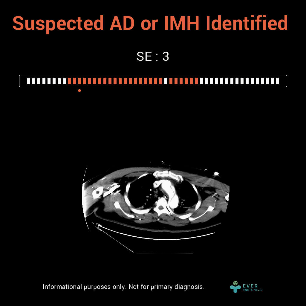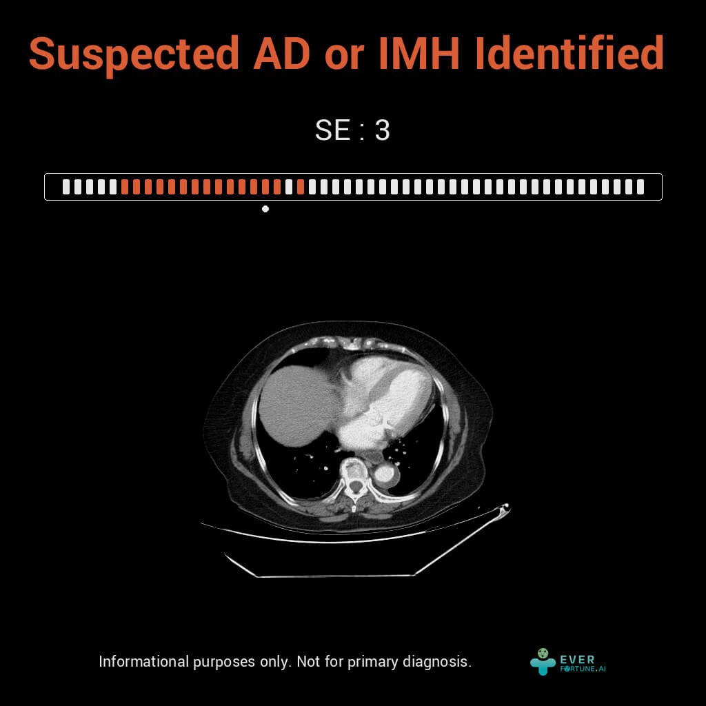 藉由人工智慧演算法分析胸腔電腦斷層血管攝影, 協助醫療專業人員優先判讀疑似主動脈剝離 (Aortic dissection, AD) 或主動脈壁內血腫 (Intramural hematoma, IMH)病患,以利提高患者及早治療的機會